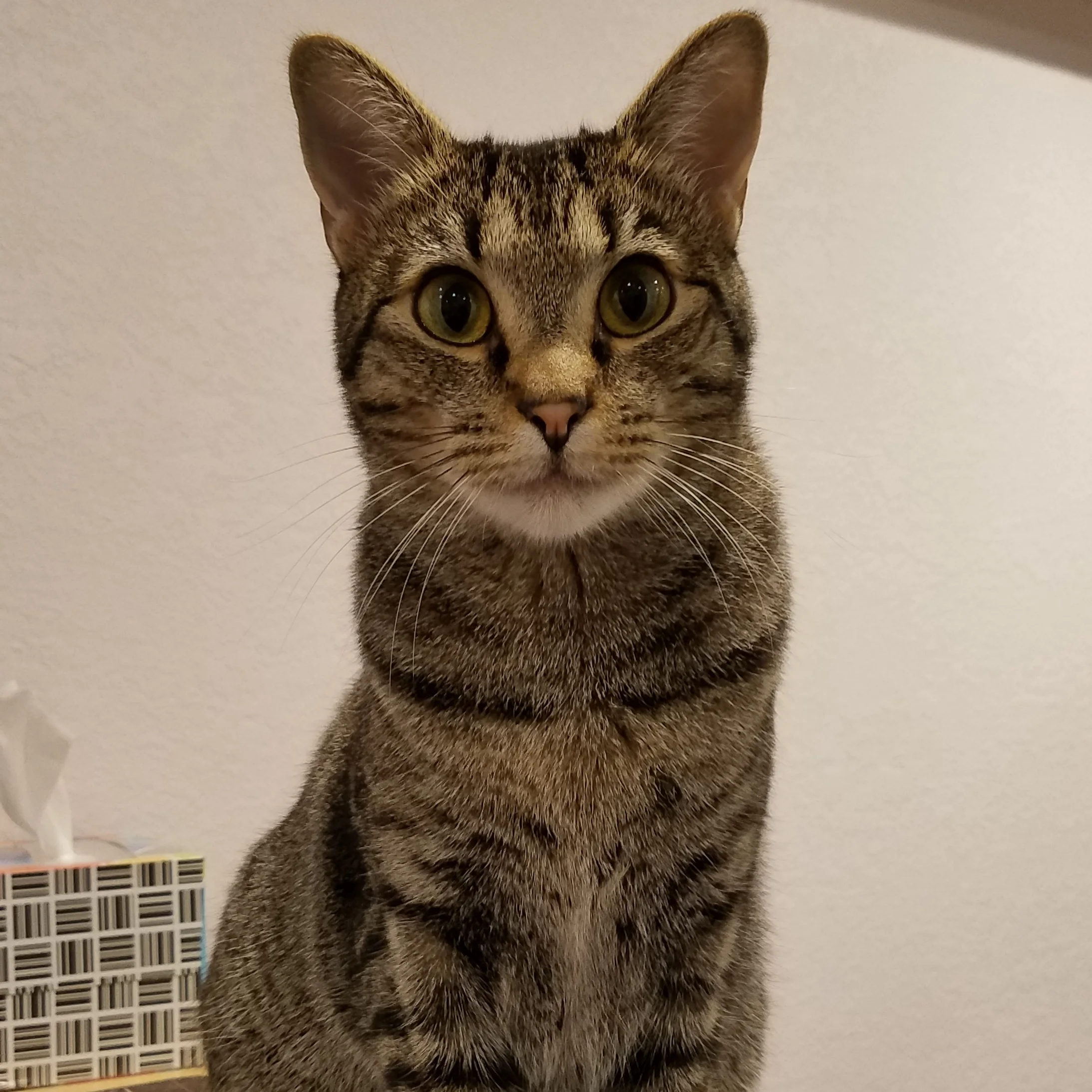 ID: A grey tabby, Mochi, sits atop a table and looks at the camera.